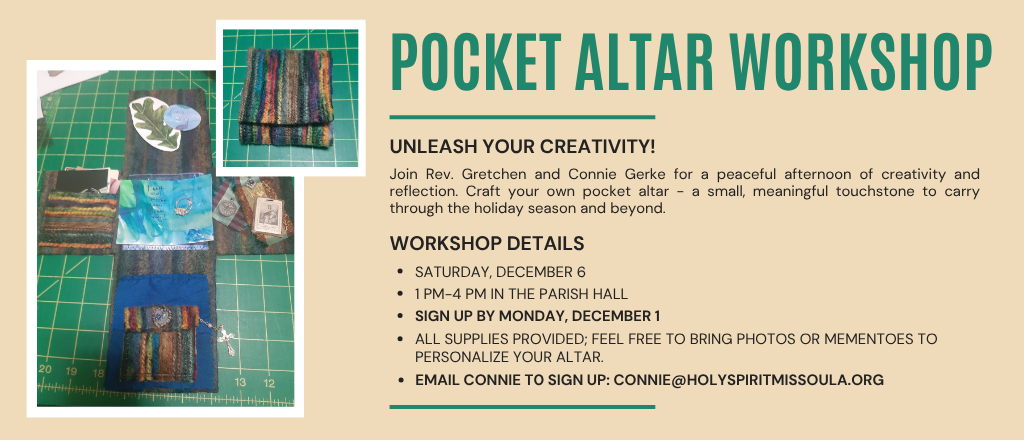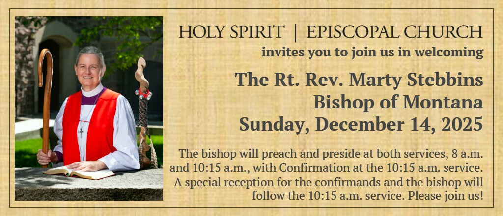 Join us as we welcome The Rt. Rev. Marty Stebbins, Bishop of Montana, for her annual visitation to Holy Spirit. She will preach and preside at the 8 am service, and preach, preside, and celebrate Confirmation at the 10:15 a.m. service. A special offering will support the Bishop's Discretionary Fund. All are welcome!